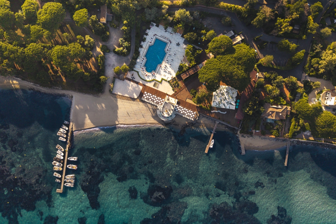 Die Lage des Hotels ist unvergleichlich: Ein Hügelgrundstück von zehn privaten Acres mit Palmen, Pinien und sanften Rasenflächen führt direkt zur Poollandschaft, zum Restaurant und zum Beach Club am Meer. Gäste können mit dem Yacht-Tender direkt vor der Unterkunft anlegen oder die private Jetty für eine kostenfreie achtminütige Fahrt ins malerische Fischerdorf Saint-Tropez nutzen. Ein zweites Speedboot bringt Hotelgäste zu den berühmten Stränden von Ramatuelle und Pampelonne.