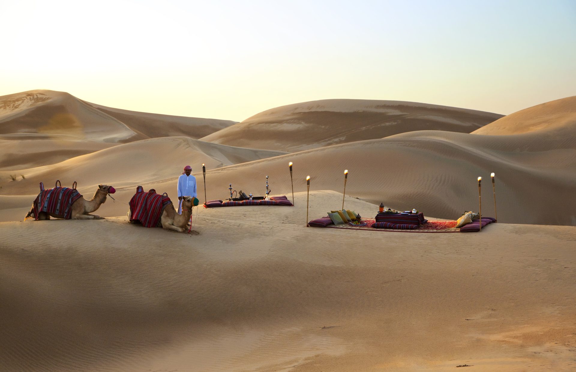 Helikopterrundflug über die Dünen. Dinner unter Sternen mit Shisha, Live-Musik und Teppichlounge. Wüstensafari im privaten SUV mit Falkenshow, Reiten und Yoga bei Sonnenaufgang.